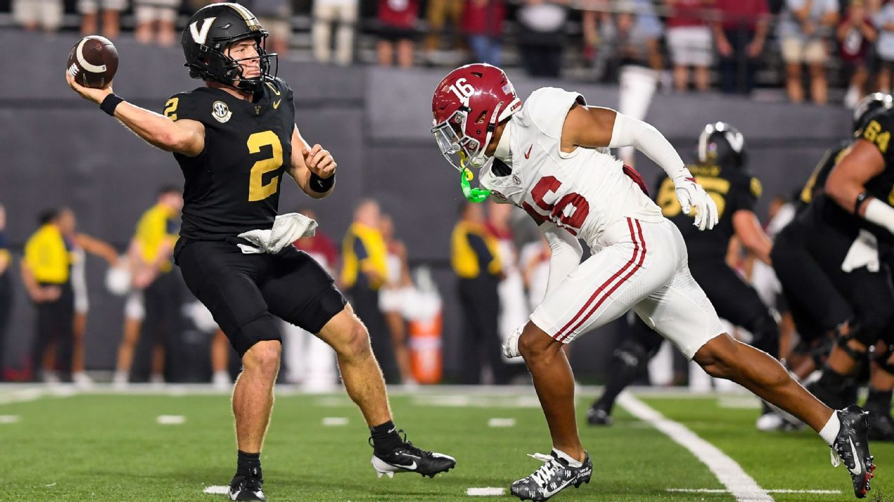 Vandy has to go to Tuscaloosa this time, which sets up a revenge opportunity. But the Commodores are much better this time. They’re 11th in SP+, and they’re scoring 49 points per game. Diego Pavia is third nationally in Total QBR (and maybe the second-best power conference quarterback to date), completing 75% of his passes and averaging nearly 7 yards per non-sack carry. Backs Sedrick Alexander and Makhilyn Young are averaging 6.9 yards per carry, tight end Eli Stowers is catching everything and receiver Junior Sherrill has scored on five of his 17 receptions.