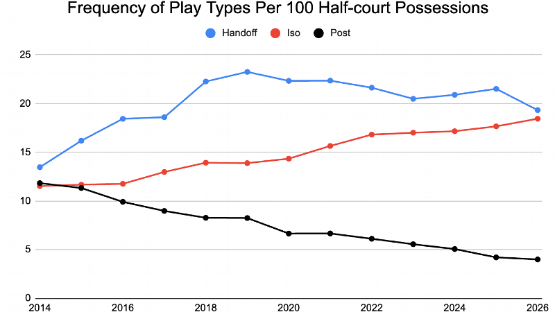 Indeed, the NBA was in the midst of massive strategic changes at the end of the 2010s, and the post-up was a chief casualty. In 2013-14, the first season of GeniusIQ tracking data, teams averaged 11.8 post-ups per 100 half-court possessions — about the same as isolations and handoffs. But while the frequency of isos and handoffs has increased by more than 50% since then, post-ups have declined by two-thirds, to just 4.0 per 100 half-court possessions in 2025-26.