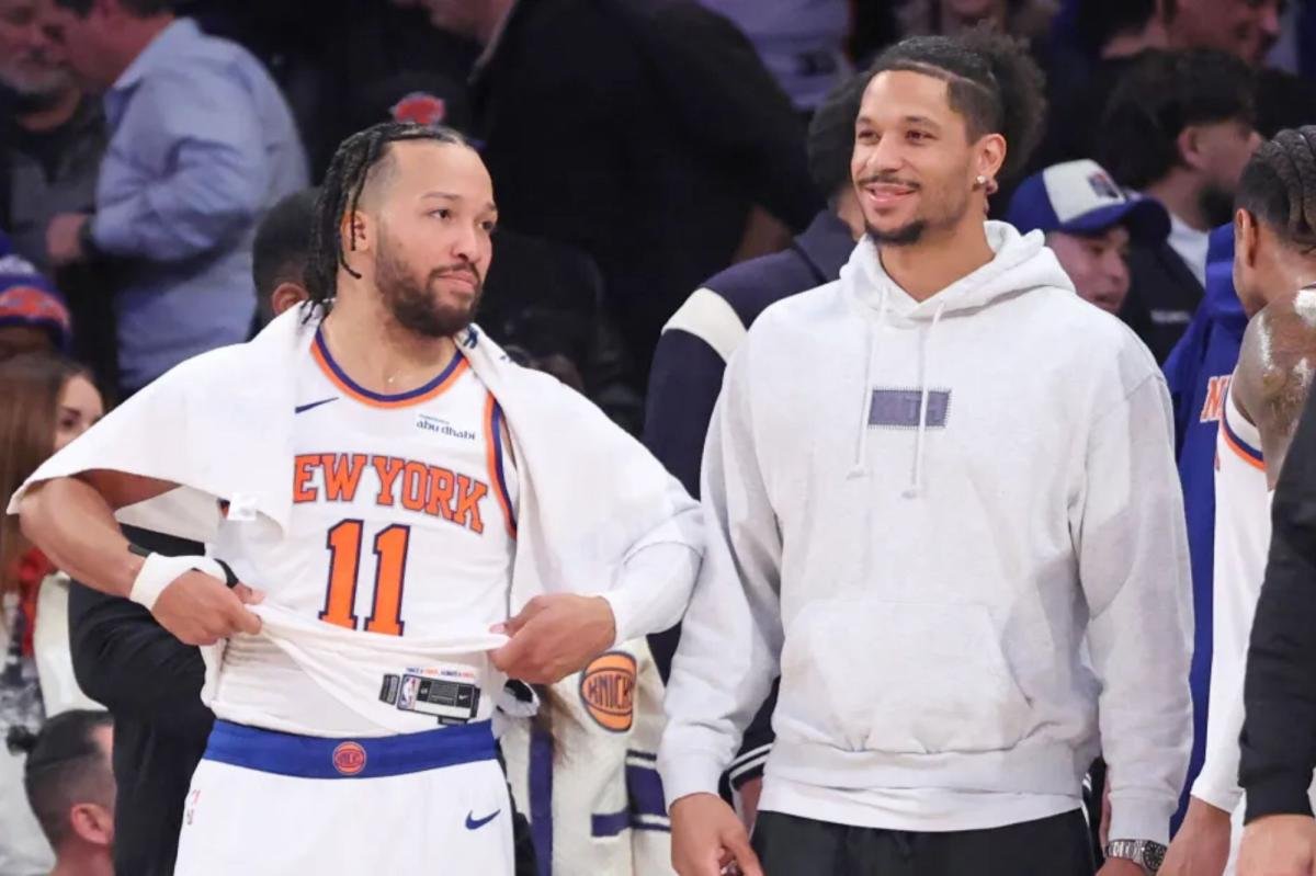 Josh Hart, who could return to the Knicks lineup Sunday against Portland, shares a laugh with Jalen Brunson during the Knicks' win over the Clippers on Jan. 7, 2025 at Madison Square Garden.