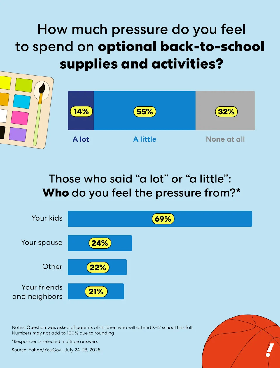 The majority of parents (68%) feel pressure to spend on optional back-to-school shopping and activities, according to a new Yahoo/YouGov poll of 1,729 U.S. adults. And any parent will tell you, back-to-school spending goes well beyond the class supply list, as we shell out for everything from youth sports fees to after-school care and more. More than a quarter of parents (28%) anticipate spending $500 or more on back-to-school expenses, and 75% plan to spend over $100.