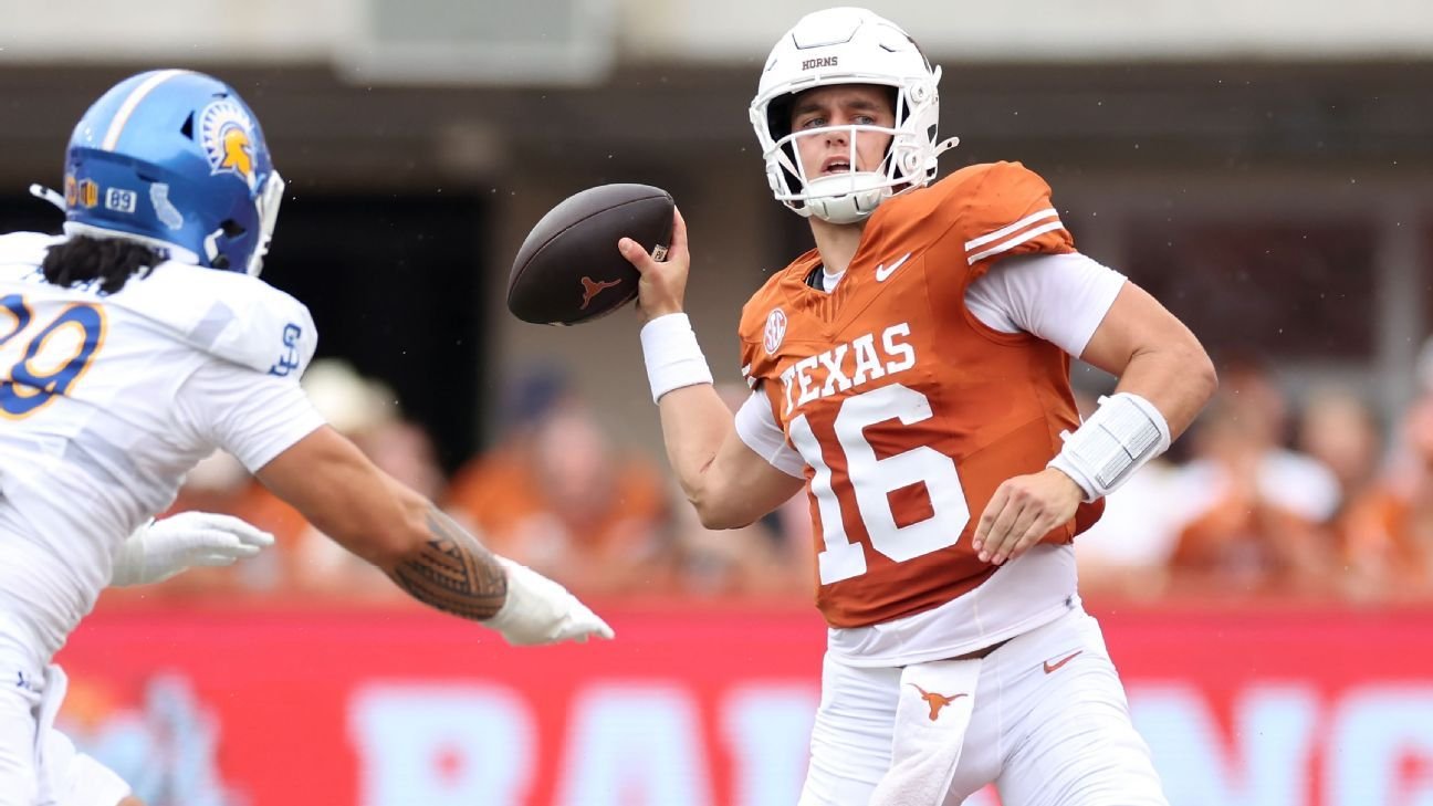 After a humbling season debut against Ohio State’s defense — quite possibly the best he’ll see all year — Texas’ Arch Manning settled in Saturday against San José State. In the Longhorns’ easy 38-7 win, he threw for 295 yards and four touchdowns, sprinkling in a trio of non-sack rushes for 30 yards and another score. After another slow start (his first six passes netted just 11 yards), he connected for touchdown passes on four of five throws, and with major help from a defense that was forcing a cascade of turnovers, the Horns went up 28-0 before the Spartans knew what hit them. This one was easy.